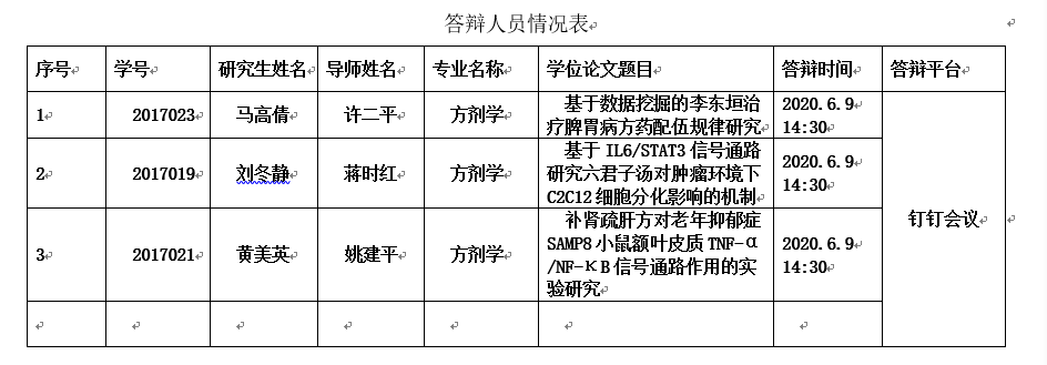 基础医学院硕士研究生第八组(方剂学专业)于2020年6月9日进行学位论文答辩,欢迎参加,特此公告!