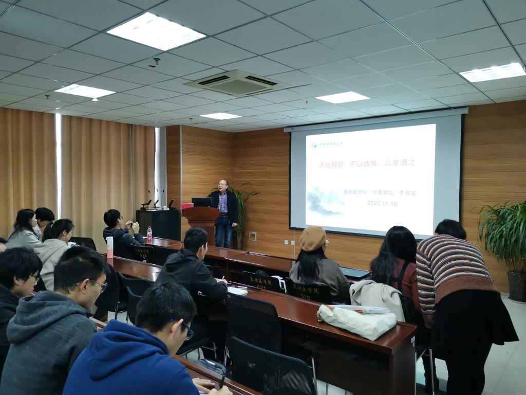 为进一步推动我院学术学风建设,增强我院研究生的学术氛围,加强学生对中医基础理论的理解及中医思维的构建,促进师生间学术交流,按照校党委研工部《2020年度研究生‘仲景杯’学术创新活动月实施方案》的文件要求,基础医学院主办的2020-2021学年第一学期“名师·名家面对面”活动于11月25日上午在学院学术交流中心顺利举行。校医古文教研室主任李具双教授应邀以“天地阴阳,不以数推,以象谓之”为主题作专题讲座,基础医学院博士生、硕士生、本科生代表共计60余人参加。讲座由学院研工办主任张文娴老师主持。