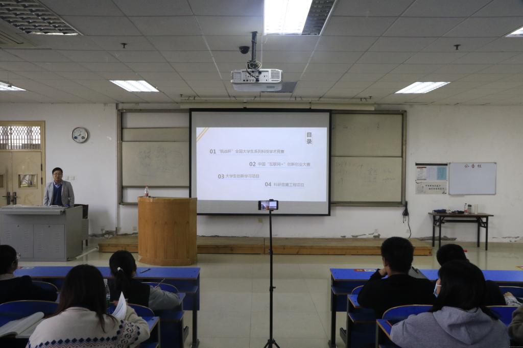 讲座伊始,吴明明老师以互动提问的形式引入科研赛事的话题,介绍优秀学长学姐在科研方面的成绩,展示了历年获奖的经历,让同学们更加直观地了解科研竞赛的魅力和积极参与科研项目对于当代大学生的必要性和重要性。随后,吴老师分别介绍了“挑战杯”全国大学生系列学术竞赛、中国“互联网+”创新创业大赛等大学生科技创新赛事的相关内容及申报流程,同时又列举实例,结合自身经验向同学们介绍了如何做好项目选题与策划,阐述了参加科研赛事对提升个人能力的重要性,强调了大学生科研意识的培养,鼓励学生积极参与此类科研活动并对本学期即将开展的“挑战杯”全国大学生课外学术科技竞赛进行了宣讲。