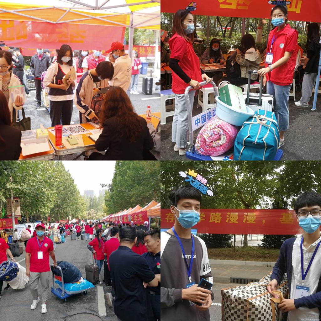 在学校疫情防控常态化下,为巩固我校疫情防控成果,保证迎新工作的顺利进行,确保2020级新生安全有序地报到,基础医学院学工办、分团委提前部署,及时研究制定迎新工作方案,组织动员并培训2020级助班、学生会成员及志愿者团队积极参与到迎新工作中,设立了“一站式”报到手续办理处和“一对一”精准帮扶的志愿者团队,并明确工作人员报到流程、内容和志愿者搬运行李,引导新生完成线上、线下报到以及宿舍入住的帮扶流程。报道当天,学院还制作独具特色的“迎新大门”,“学贯中西”的楹联与门两旁“秉承中华瑰宝悬壶济世有妙手,运用西方科学治病救人多奇方”的对联交相呼应,尽显学院办学特色,引得众多新生留影纪念。特别是我院志愿者们头戴“爱我大基础”字样的头饰,穿梭于迎新现场,有的帮助拿行李、有的引导报到,把各项工作做到井然有序。虽然今年新生父母不能陪同入校,但是所有新生一入校门都被现场氛围和热情似火的志愿者、老师们的帮助感动,感觉很亲切。
