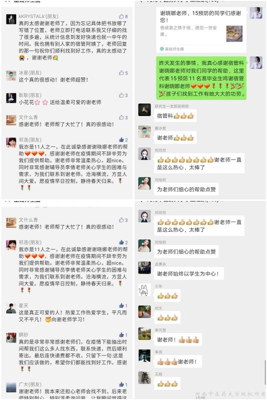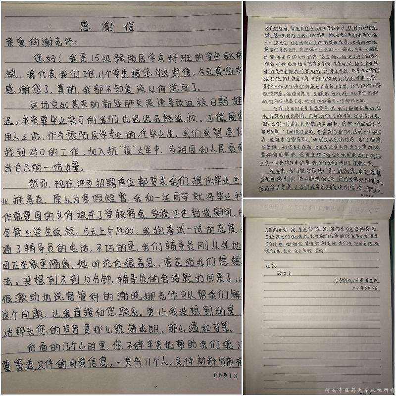 现在正值招聘季,作为即将毕业的预防专业的本科生,许多单位都在网上向他们伸出橄榄枝,可是一些同学将毕业生登记表等应聘材料遗留在了寝室。学校正值封校期间,学生拿不到这些材料势必贻误找工作的时机。就在一筹莫展的时候,他们通过辅导员联系到宿管科的谢晓娜老师。不到半天的时间,谢老师去到9个不同的寝室,楼上楼下地奔波,为每一位同学找齐材料,并一一拍照片打电话核对,又辗转两家快递公司,自费把材料及时准确地寄给分布在11个不同省市的同学们,解决了大家的后顾之忧。