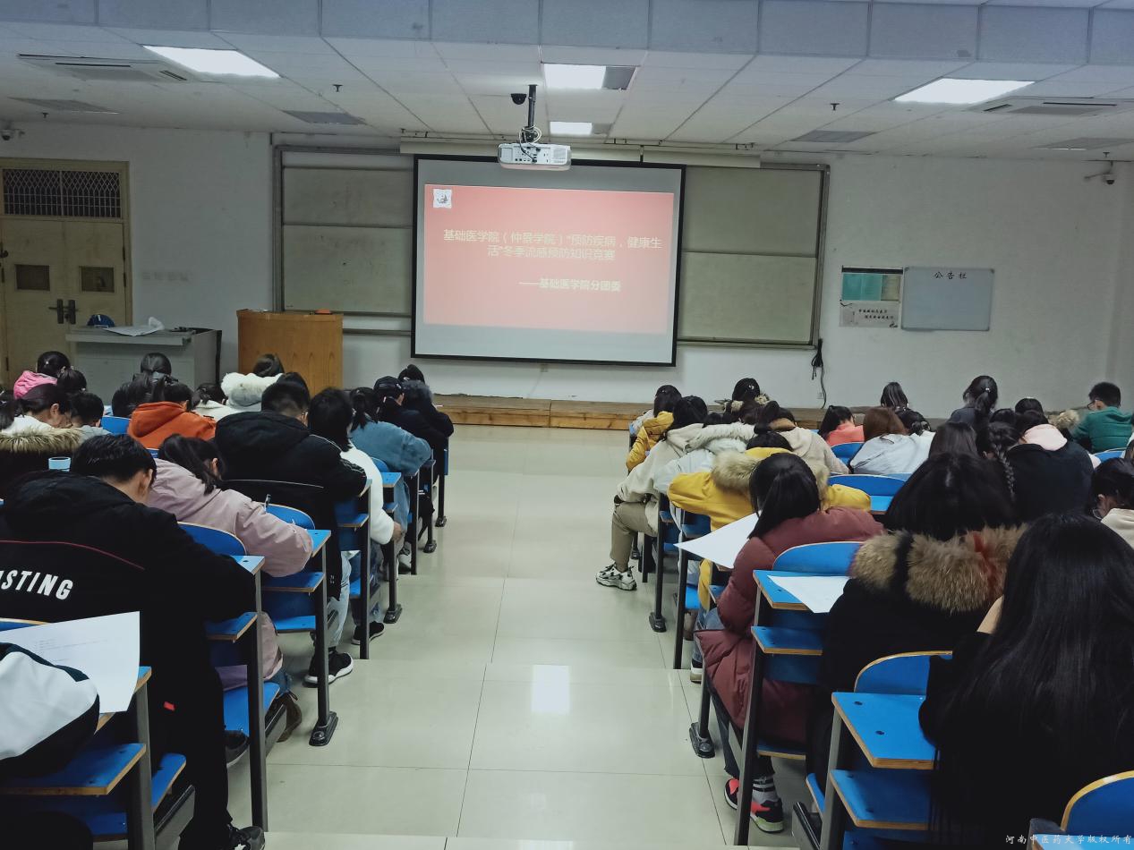 为普及冬季流行病防治知识,预防冬季流感的发生,保证广大学生身体健康,12月5日,基础医学院生活实践部在四楼阶教举行“预防疾病,健康生活”冬季预防疾病知识竞赛,18、19级两百余名同学参于竞赛。