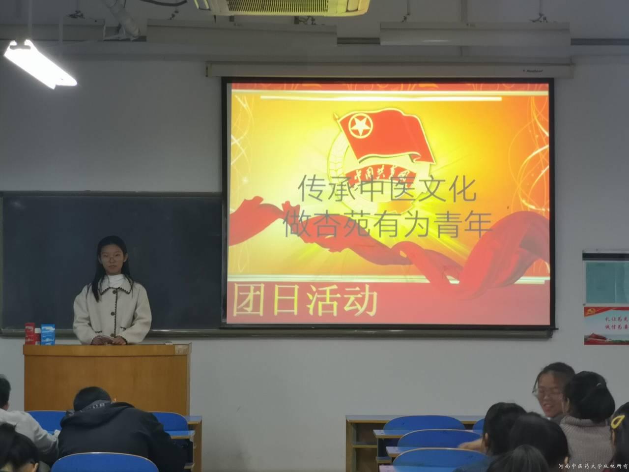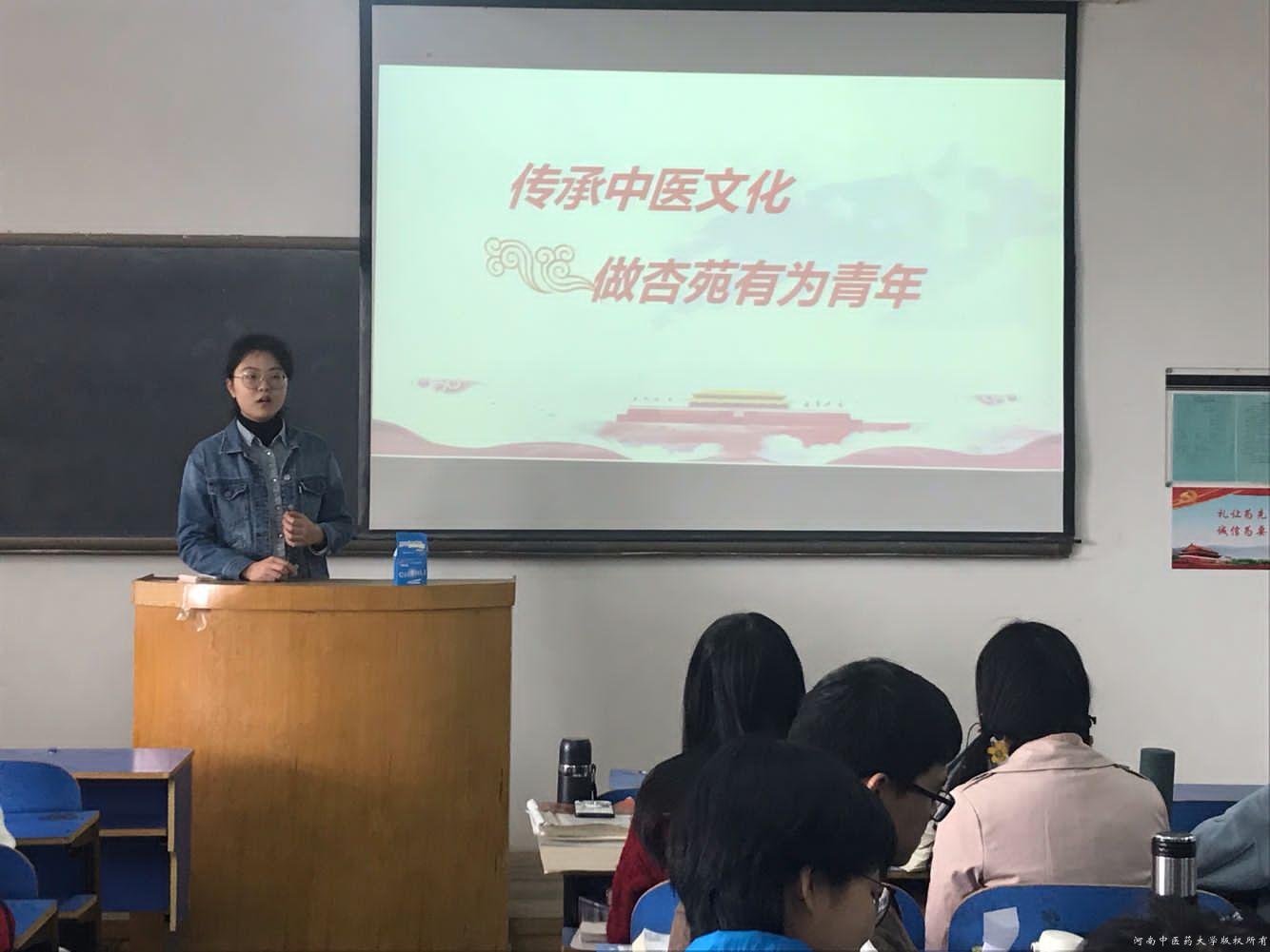 本次团日期间,各团支部通过丰富多彩的形式,如同唱《中国共产主义青年团团歌》,观看以中医为主旋律的《指尖上的中医》、《大医精诚》等影片,来增强同学们的时代责任感和使命感,进一步加深同学们对中医药的认识和对国家中医药发展态势的了解。在“团旗下的演讲”环节中,同学们积极主动参与其中。各团支部的演讲绘声绘色、精彩纷呈,不仅赢得了阵阵掌声,更展现了我院青年学子对传承发扬中医药文化的满腔热忱,在院系范围内全面掀起青年热情传承中医药文化的热潮。