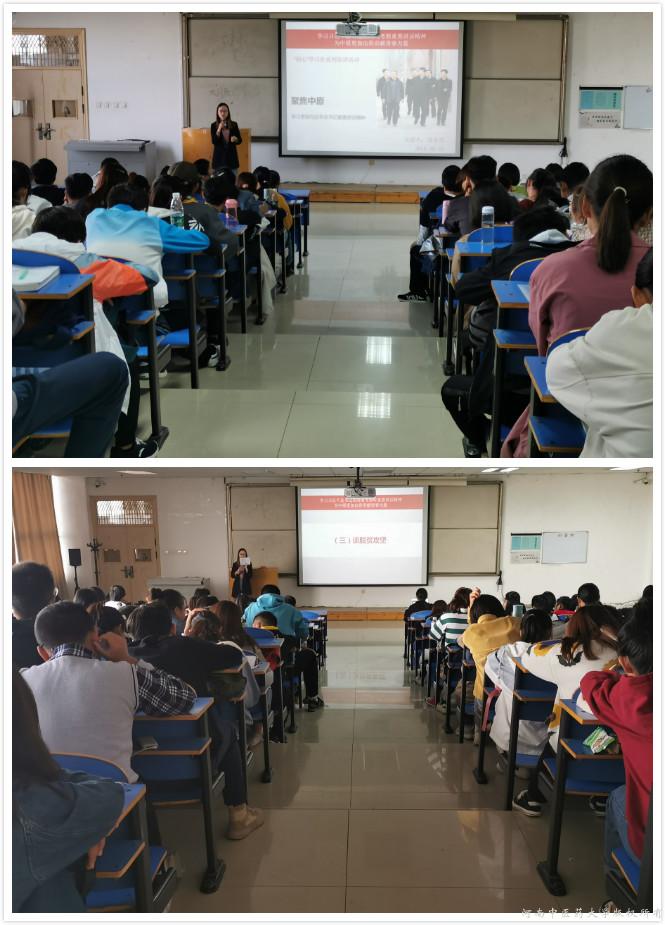 为了解习近平总书记考察河南的主要内容,学习习近平总书记重要讲话精神,同时号召当代青年坚定理想信念、塑造高尚品德,始终把牢正确人生方向,自觉引领时代文明新风,基础医学院思修社分别于2019年10月28和29日中午在四楼阶教举办了两场关于“学习习近平总书记重要讲话精神”的宣讲活动。该活动由校马克思主义学院2019级研究生马小月同学宣讲,基础医学院2019级新生全体参与学习。
