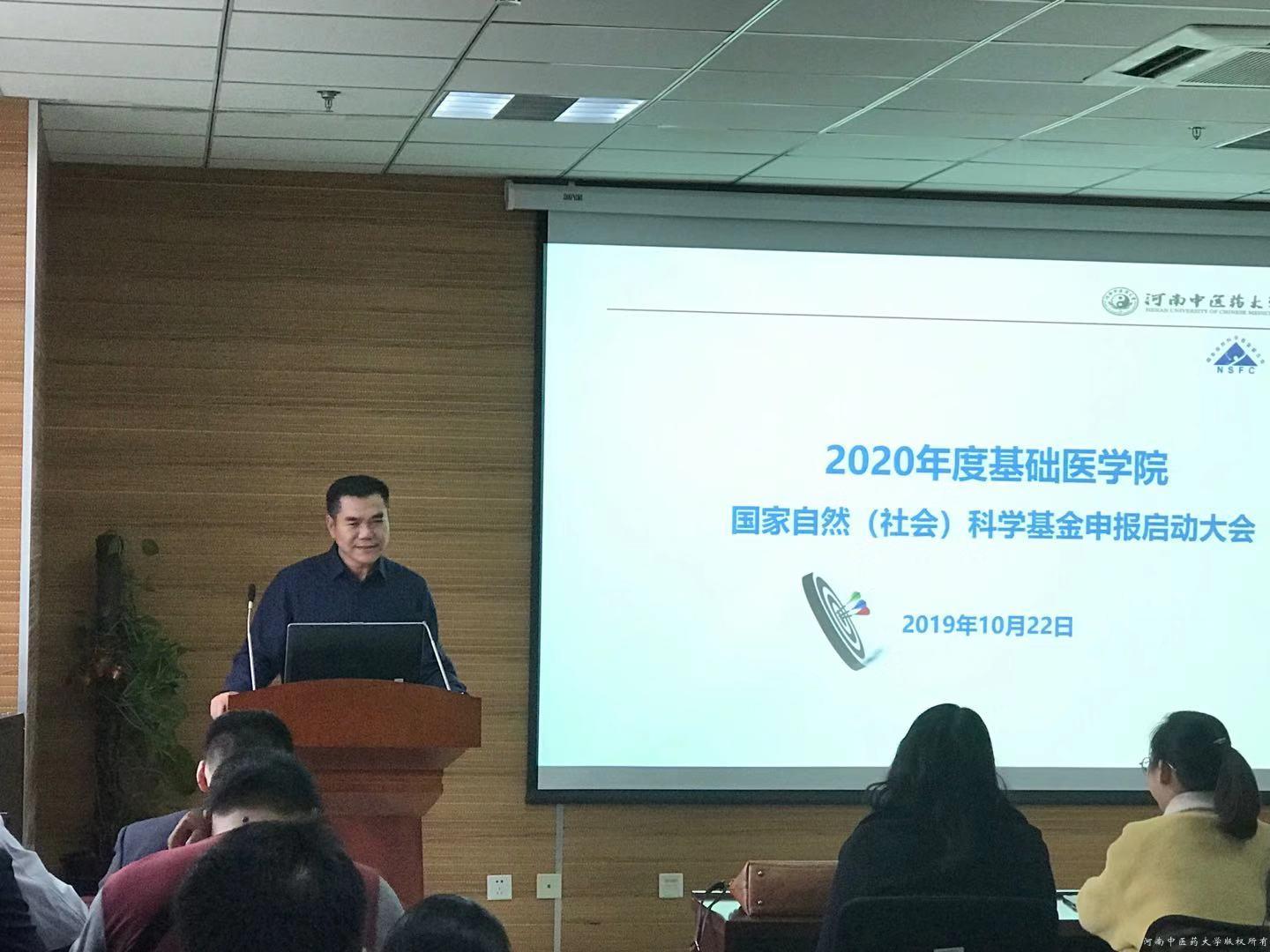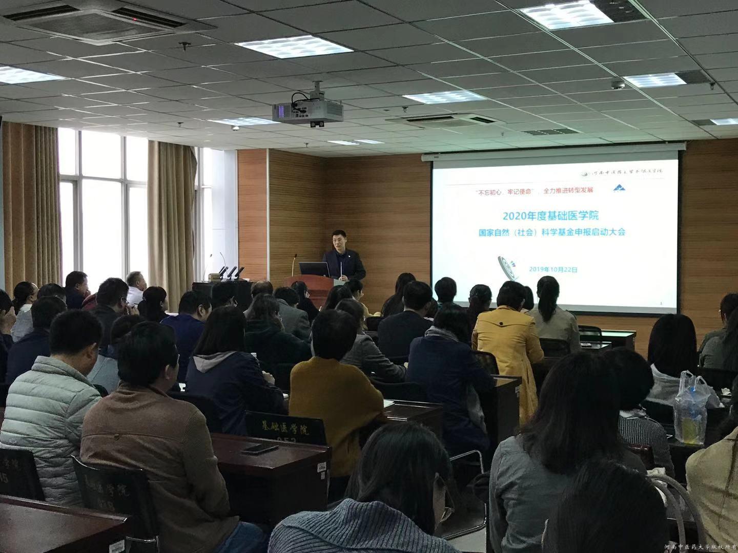 按照学校《关于举办第十届仲景学术文化节的通知》要求,以“不忘初心、牢记使命”主题教育为契机,基础医学院于2019年10月22日下午在教学大楼BS820会议室顺利召开国家自然科学基金项目申报启动暨培训大会,院长李根林出席并讲话,学院各学科、教研室负责人、青年骨干教师、全体博士研究生和硕士研究生代表参加会议。会议由副院长李宁主持。