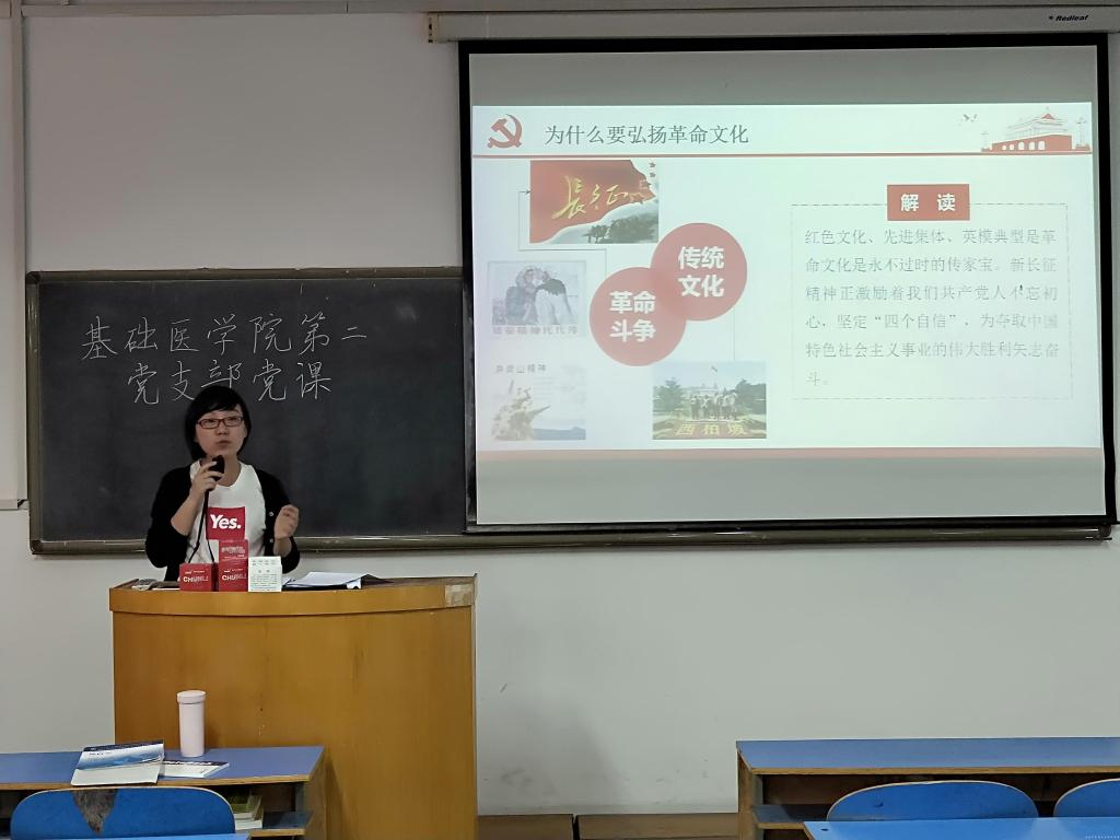 为帮助基础医学院(仲景学院)本科生第二党支部全体学生党员正确领会“文化自信”的内涵和意义,更好地了解与传承革命文化,4月19日中午,基础医学院本科生第二党支部在A437教室举办以“弘扬优秀革命文化,增强文化自信底气”为主题的党课教育活动。基础医学院本科生第二党支部副书记李倩老师作为此次党课的主讲人,本科生第二党支部全体学生党员参与此次党课学习活动。