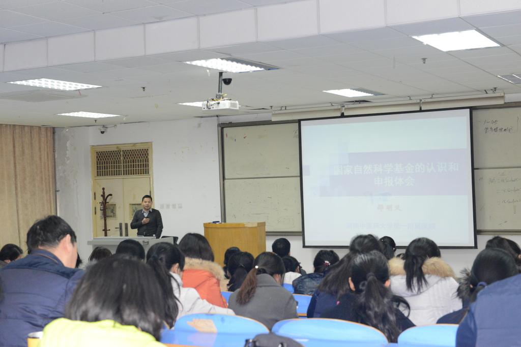 2018年1月2日下午,河南中医药大学第一附属医院邵明义博士应邀做客我校博士沙龙,在教学实验综合大楼3楼阶梯教室作了题目为“国家自然科学基金的认识和申报体会”的学术报告。基础医学院全体教师和研究生参加了此次报告会,会议由基础医学院副院长李宁主持。
