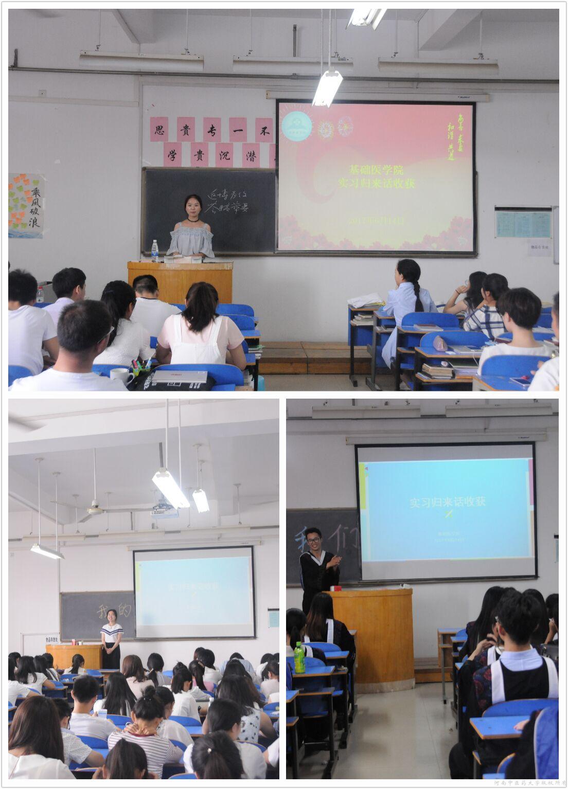 实习是学校教育向课堂外的一种有效延伸,也是推进素质教育进程的重要手段。随着本年度毕业季的到来,6月14日上午,基础医学院各专业毕业班相继举办了“实习归来话收获”交流会活动。