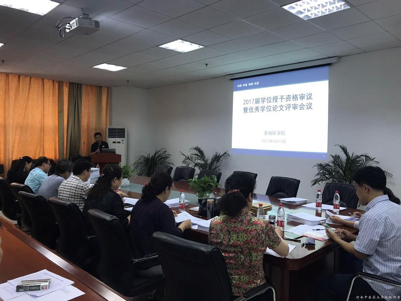 6月13日下午,医学基础学科学位分委员会在基础医学院四楼会议室召开学位分委员会工作会议,分别审议基础医学院2017届毕业生博士、硕士及学士学位授予资格并进行优秀硕士学位论文评选。