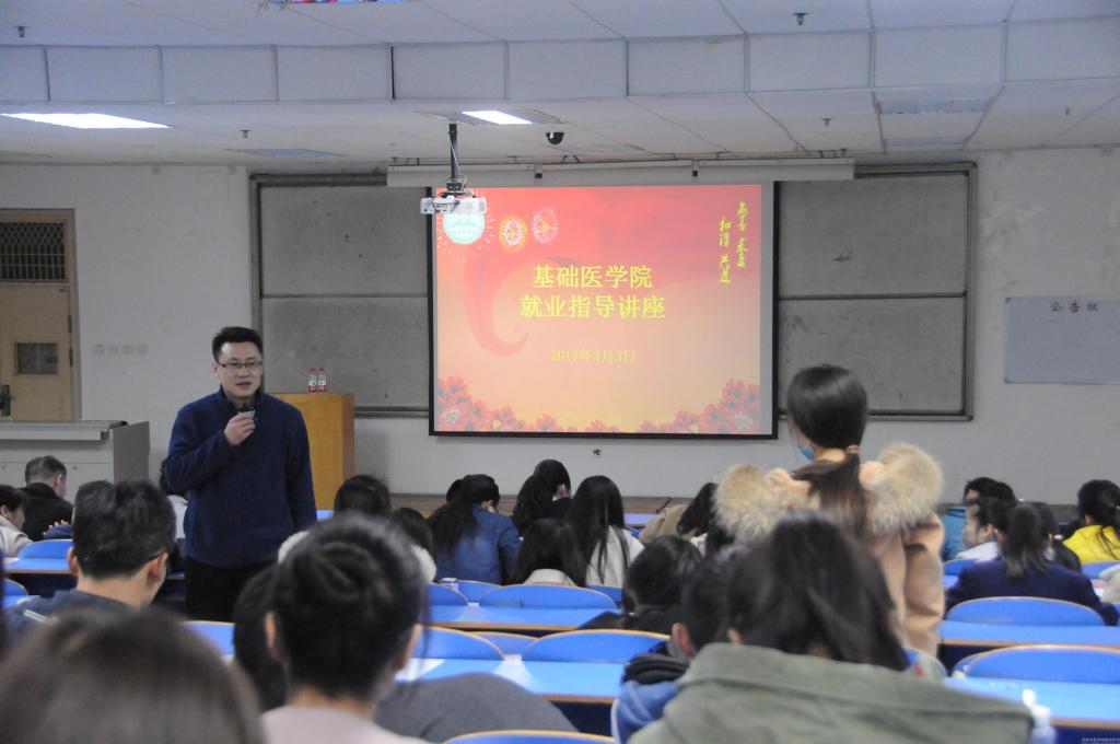 为迎接双选会的到来,解决2017届毕业生就业方面的疑惑,3月3日晚,基础医学院党委副书记朱平生于二楼阶教开展就业指导讲座,2017届毕业生辅导员刘旭初及2017届全体毕业生参加了此次讲座。