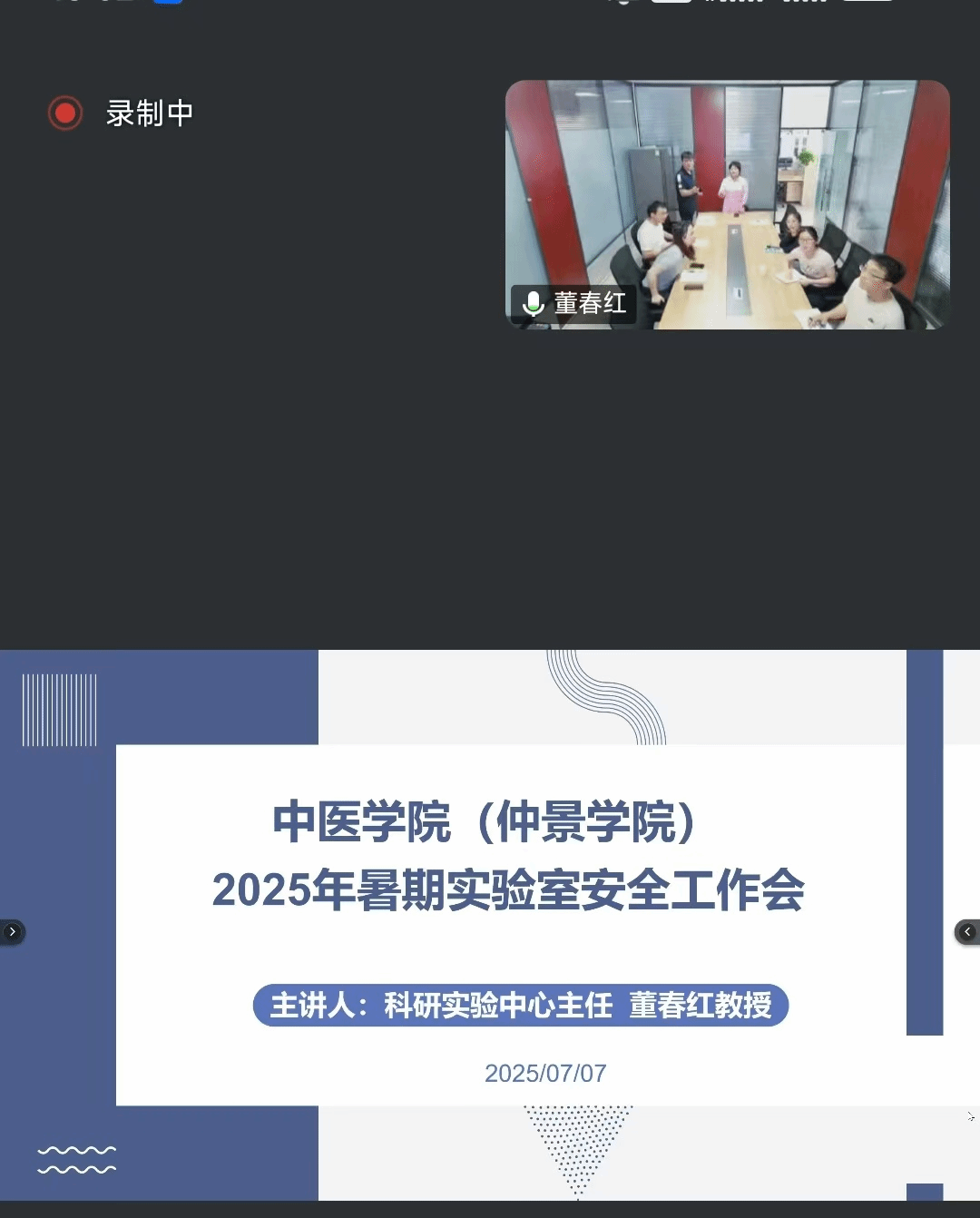 本网讯(文/刘保光 赵紫薇 图/史金玉)为防范暑期高温季节安全风险,中医学院(仲景学院)科研实验中心于2025年7月7日组织召开暑期实验室安全工作专题会议。会议以线上线下结合形式开展,科研实验中心主任董春红教授主讲,全体实验室安全值班教师及各团队师生参会。