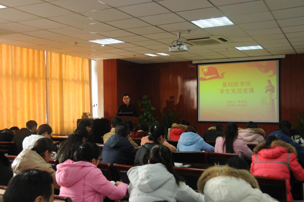 为推进“两学一做”学习教育,深入学习贯彻党的十八届六中全会精神,11月25日下午,基础医学院党委副书记朱平生在教学楼BS820为我院全体学生党员讲党课,基础医学院研究生、本科生各党支部书记、支部委员、学生党员等60余人聆听了此次党课。