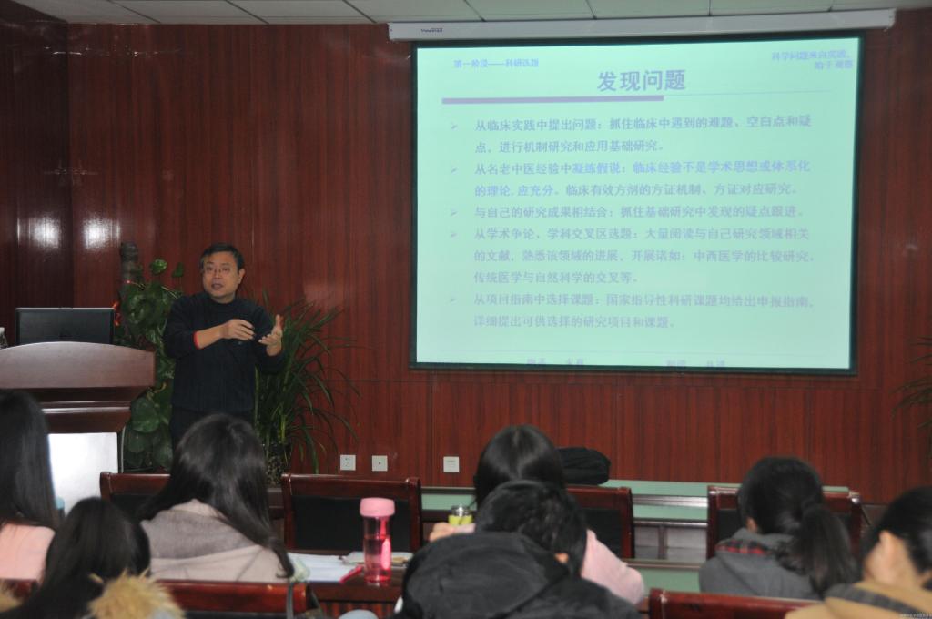 杨老师首先用对比的手法再度阐述了科学、技术、知识、能力四者之间的关系,与本实训系列讲座的第一讲相呼应。他强调科技是科学和技术的交集,能力是知识和技能的交集;科学的目的在于生产知识,而科技的目的在于应用知识。他建议大学生做科研项目务必改变思想观念,由“知行合一”转变为“思行合一”。而后,杨老师指出医学研究过程的五个阶段,分别是科研选题、科研设计、组织实施、资料处理、分析总结。其中他重点阐述了“科研选题”的技巧与方法,就科研选题的四个步骤即“发现问题”、“文献查阅”、“假说形成”、“陈述问题”逐一展开论述。他提出“选择课题、确定并坚持主攻方向是科学研究中具有战略意义的首要问题”的观点,并举出具体事例论证这一观点。最后,杨老师向大家传授科研基本技巧,如建议大家从“临床实践”、“名老中医经验”、“学术争论、学科交叉区”等领域发现问题并确定自己的课题。同学们积极参加讲座,按照杨老师的要求课下做功课,逐渐形成自己的科研意识。