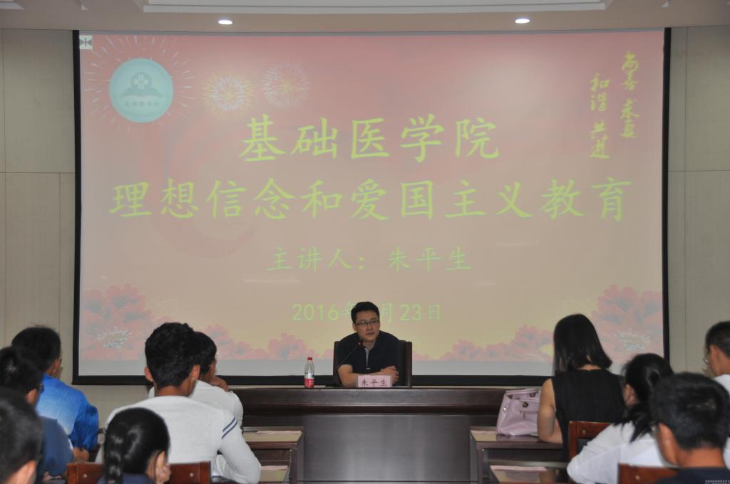大学生思想政治教育是高校共青团育人工作的核心,是把握高校共青团育人方向的根本保证。9月23日,基础医学院于我校图书馆第二报告厅为2016级新生举办以“理想信念和爱国主义教育”为主题的思想政治讲座,主讲人是基础医学院党委副书记朱平生教授。