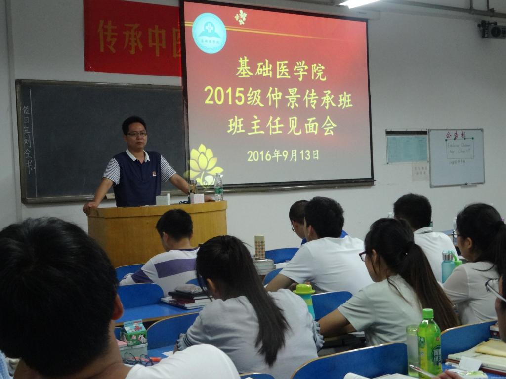 班主任是开展大学生思想政治教育的重要力量,是促进大学生全面成才、健康成长的指导者和引路人。2016年9月开学伊始,基础医学院各班陆续举行班主任新学期第一课。2015级仲景班是学校新遴选组建的传承班,9月13日,班主任孙鸿昌老师与同学们进行了首次交流会。