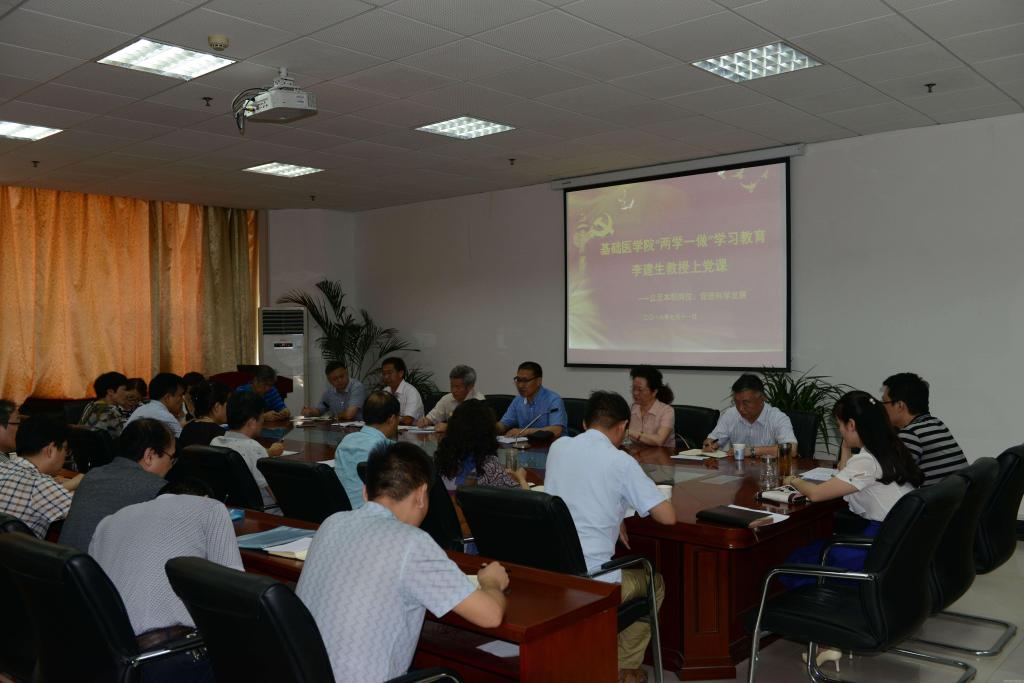 根据学校党委“两学一做”学习教育要求,7月11日上午,校党委委员、副校长李建生教授为基础医学院上了一堂题为《凝心聚力,脚踏实地,认真搞好“两学一做”学习教育》专题党课。参加党课学习的有基础医学院党委全体成员、各党支部书记、各重点学科带头人、四办负责人、各学科和教研室及实验中心主任。