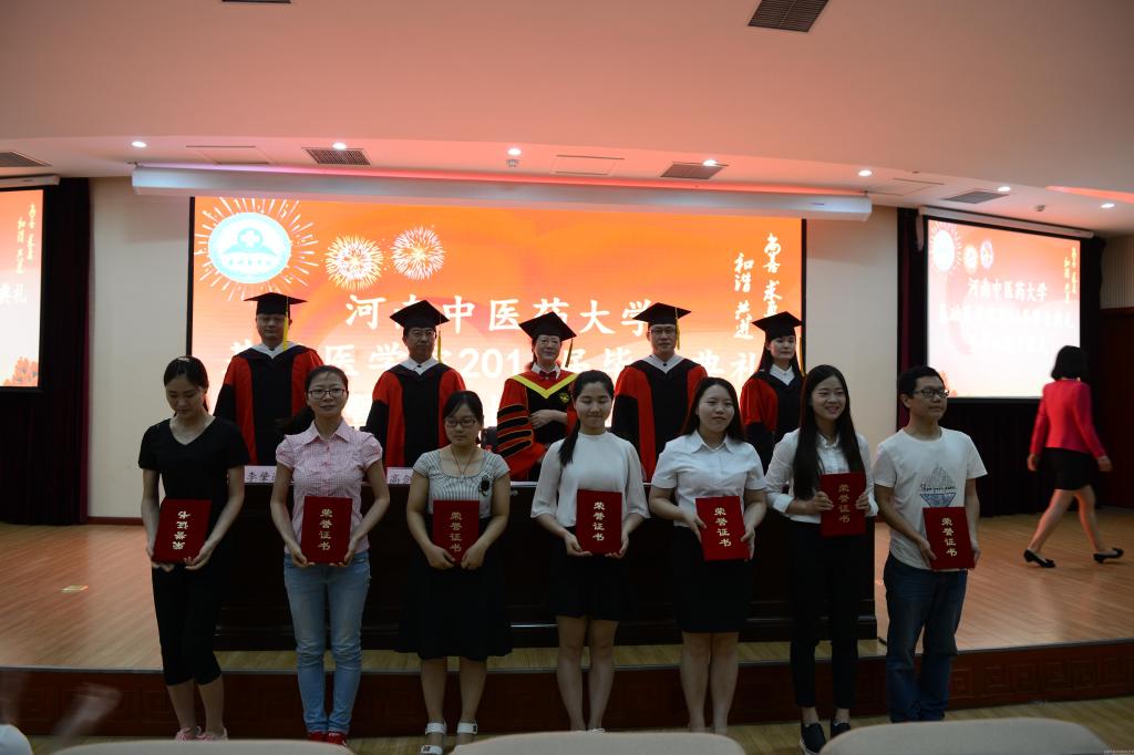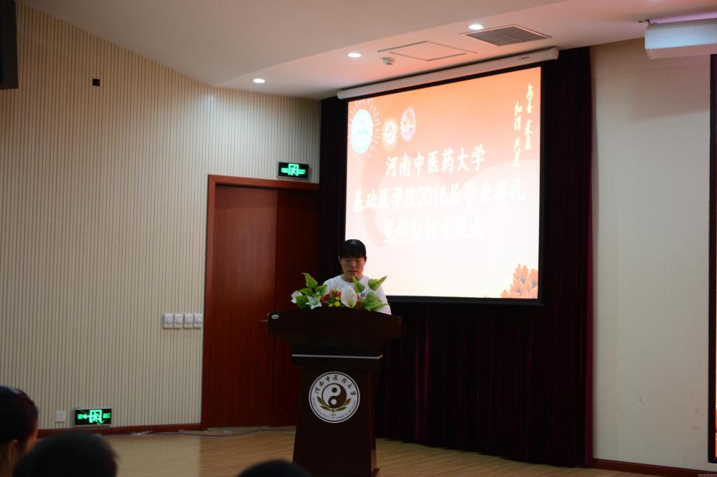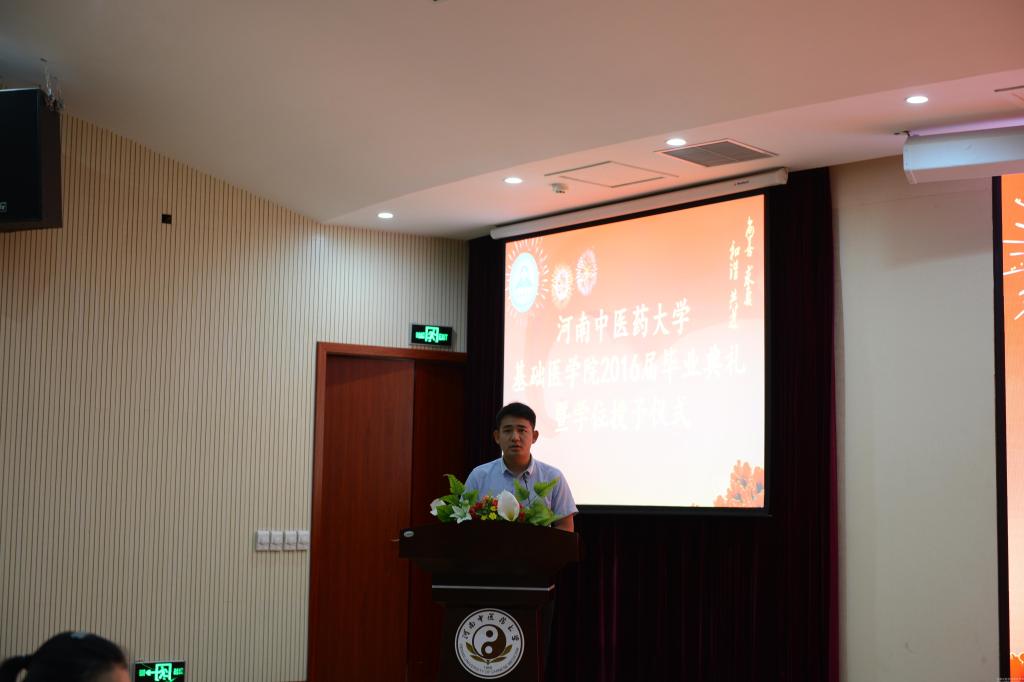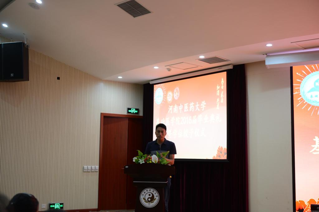 2016届优秀应届毕业生代表伊亚伟同学、往届优秀毕业生代表华润三九制药有限公司河南地区经理雷明东、教师代表中医临床基础学科谢忠礼副教授、2016届优秀毕业生家长代表陈璐同学母亲路杰女士依次上台发言,表达对学校培养的感激之情及对2016届毕业生的殷切希望。随后基础学科学位分委员会与会全体领导共同为2016届全体毕业生颁发毕业证书、学位证书、扶正流苏并合影留念。