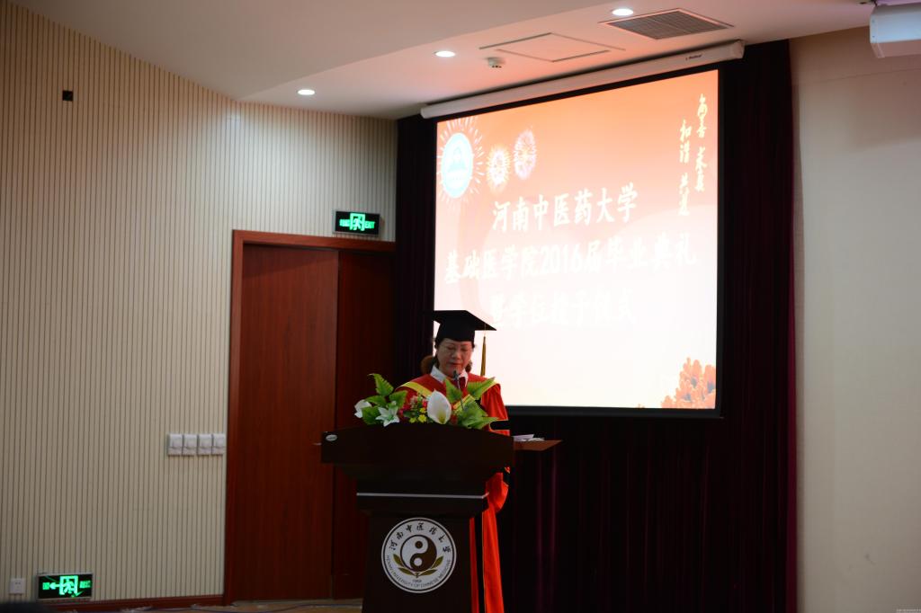 首先,基础医学院院长詹向红教授做了热情洋溢的讲话。她对2016届毕业生在校期间的取得的诸多成绩及荣誉,以及同学们在成长过程中所表现出的坚毅品质,形成的良好班风、学风和优异成绩给予了充分的肯定与赞誉,并代表基础医学院全体教工、领导,对同学们顺利完成学业表示祝贺;在同学们未来生活上,詹院长分别从 “诚信、感恩、追求、坚定”四个方面提出了希望与祝愿。同时她希望每位学子在与母校告别后,要将母校做同学们最坚实的后盾,常回家看看,勿忘恩师,保持联系,让母校及老师能及时了解毕业生们的成长和进步。