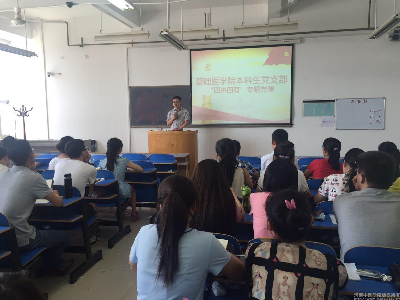 为持续推进“两学一做”学习教育工作的开展,切实落实基础医学院党委关于开展“两学一做”学习教育实施方案,6月24日,我院本科生第一党支部全体成员在教学楼A453组织开展了“四讲四有”专题党课,支部书记刘旭初老师做专题讲解,党委副书记朱平生到场列席。