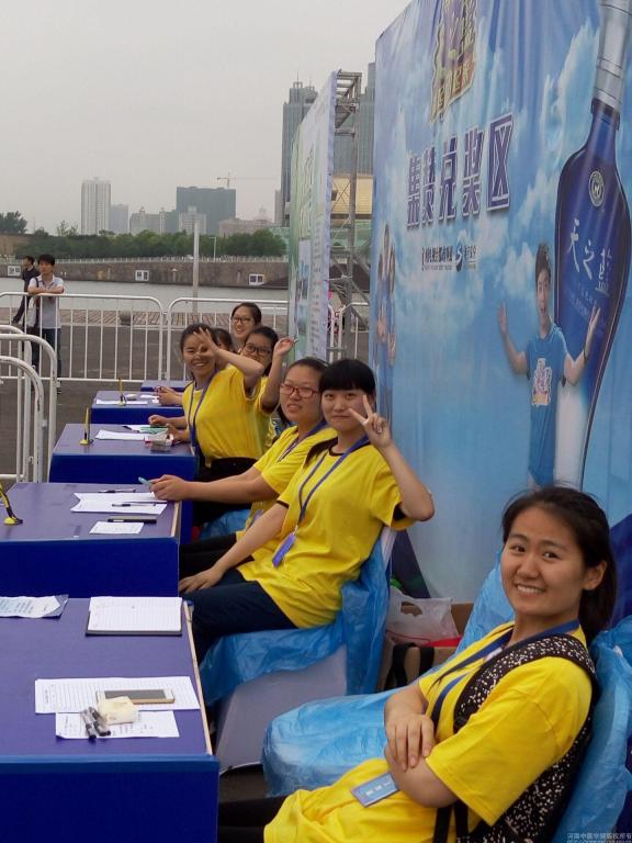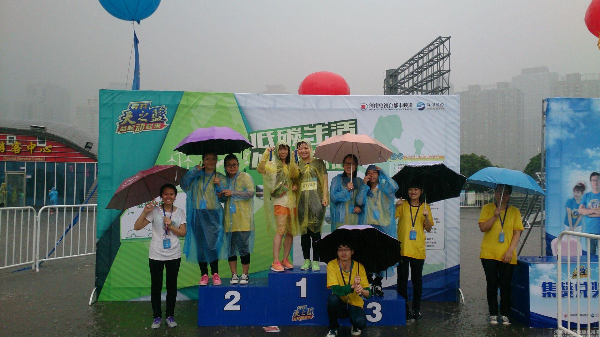早上七点,我院志愿者们到达活动地点,与相关负责人进行对接,开始活动前的准备工作。志愿者们主要负责集赞兑奖区方面的工作,为前来领奖的参与者发放活动的奖品。上午9点,河南省人民政府副省长张维宁等十一位领导冒雨登台和大家见面,并共同启动了“《河南省公民环保行为准则》百万公民电子签名墙”上线仪式,同时“寻找天之蓝”公益“乐跑”活动也正式启动。雨越下越大,但仍有市民坚持跑完全程,我们志愿者也坚守岗位,为每一位留下来并坚持到最后的人佩戴属于他们的荣誉徽章。