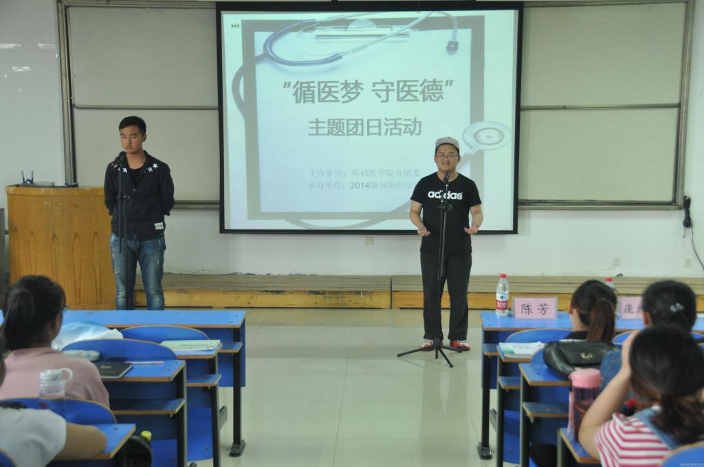 为响应校团委“团支部活力工程”主题团日的号召,进一步加强我院基层团组织建设,5月17日,由基础医学院分团委主办、2013级仲景班团支部承办的“循医梦,守医德”主题团日活动在四楼阶梯教室举行。校团委组织部副部长庞文奇、基础医学院病理学与病理生理学科讲师陈芳、基础医学院学工办全体老师、“团支部活力工程”团员小筑班全体成员以及基础医学院一百余名团员、团干共同参与了此次活动。