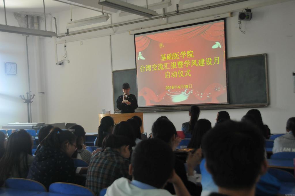 读万卷书,行万里路。2011年来,我校每年选派在校大学生赴台湾交流学习,加强我校和台湾高校交流和沟通,加深两岸学子的友谊,探索大学生培养的新模式。4月18日,基础医学院举办赴台归来交换生经验报告会,特邀我院李思燃、安义楠、武若愚三位赴台交流的同学主讲,学工办全体老师及百余名同学参加了报告会。