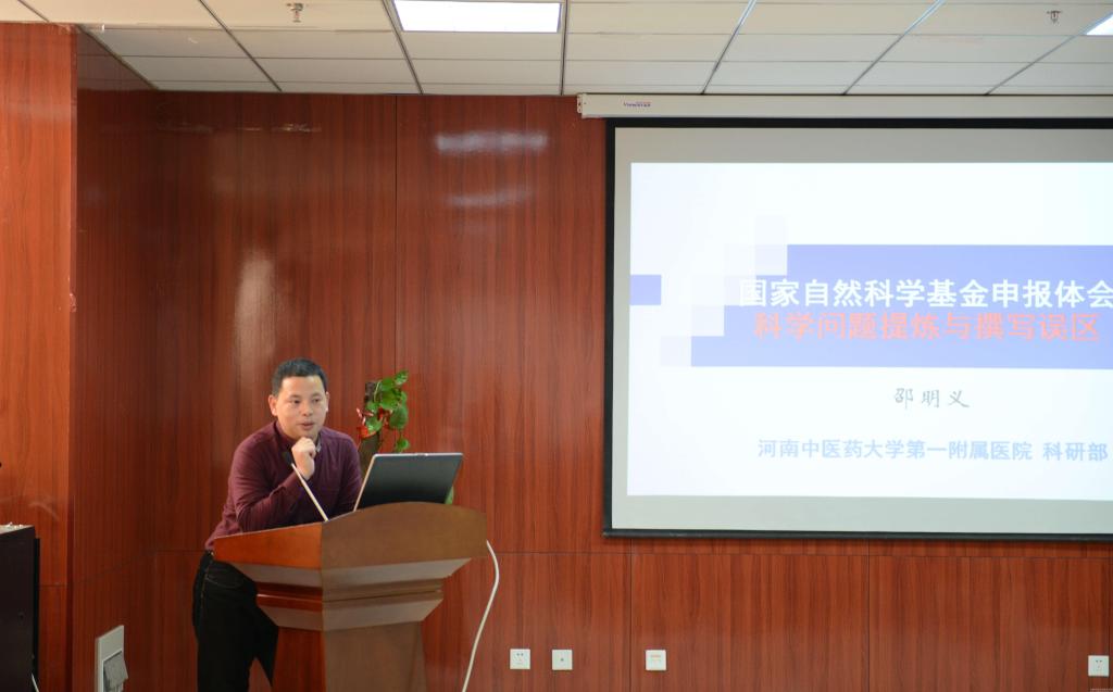 由基础医学院主办的“研究生论坛”讲座于2015年12月31日下午三点在教学实验大楼BS820举行。国家自然科学基金获得者、河南中医学院第一临床医学院科研部邵明义副主任应邀做客论坛并做了题为“国家自然科学基金申报体会——科学问题的提炼与撰写建议”的讲座,讲座由基础医学院高剑峰副院长主持,基础医学院科研骨干教师和研究生60余人聆听了讲座。