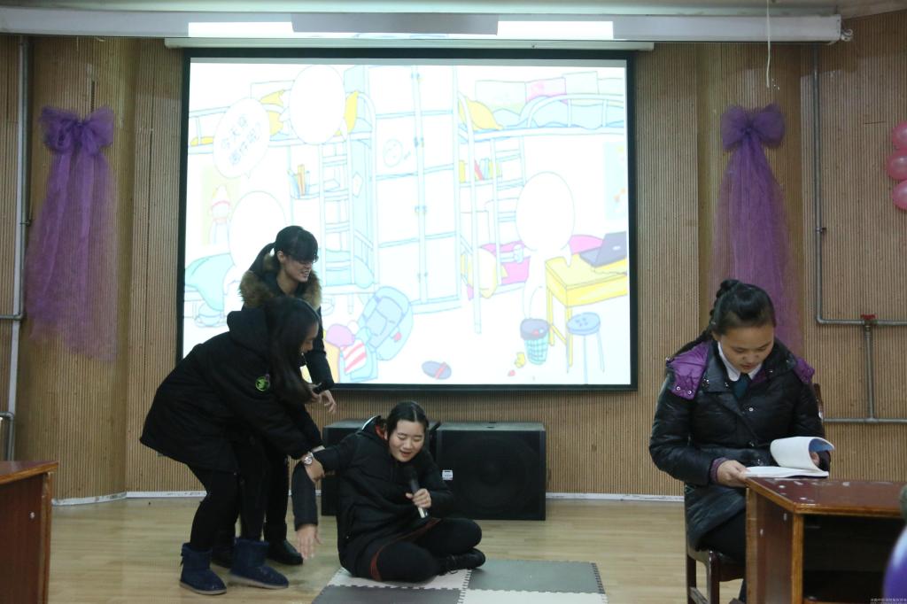 心理剧“伸开双手、拥抱阳光”讲述了大一新生康晓因家庭贫困,内心自卑封闭,无法很好地融入新环境,与寝室成员发生了一系列的矛盾,在辅导员老师和同学们的帮助下,打开心扉,找回自信与快乐的故事。本部心理剧取材于大学生群体中典型的心理案例,进行了艺术的加工和改编,经过演员生动传神的演绎和细腻的心理刻画,准确表现出在大学生人际交往中存在的共性问题,提出“换位思考”和“求同存异”的人际交往黄金法则。辅导员李倩老师全程参与演出,为整部心理剧起到了画龙点睛的作用。