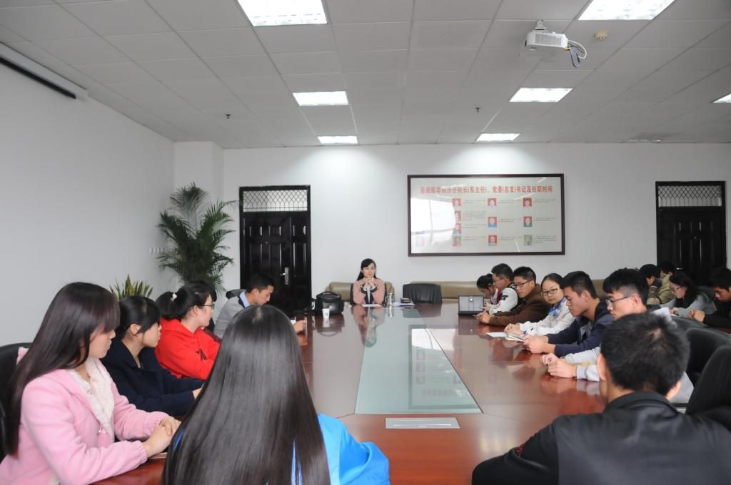 为加强教学管理,稳定教学秩序,提高教学质量,基础医学院于2015年11月4日下午在新校区基础医学院会议室召开了本学期学生座谈会和学生教学信息员座谈会。兄弟院部学生代表、我院各年级学生代表、学生信息员、教研办人员参加了座谈会。会议由基础医学院曹珊副院长主持。