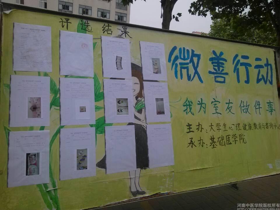 为积极配合心理健康教育与咨询中心在我校开展的第十届心理健康教育宣传月活动,基础医学院于5月8日-5月28日面向全校学生举办“微善行动——我为室友做件事”活动,取得了良好的效果。