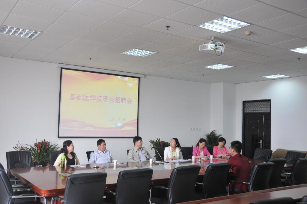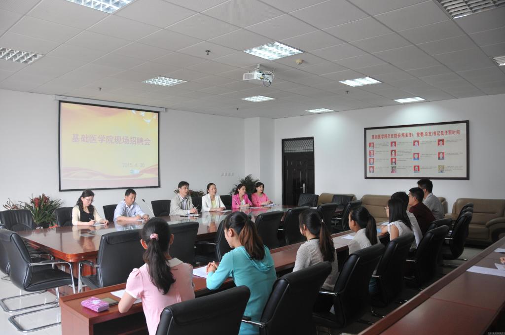 4月30日上午8点半,荥阳市疾控中心一行6人在基础医学院四楼会议室举行预防医学专业现场招聘会,预防医学2015届20余名毕业生进入面试环节。