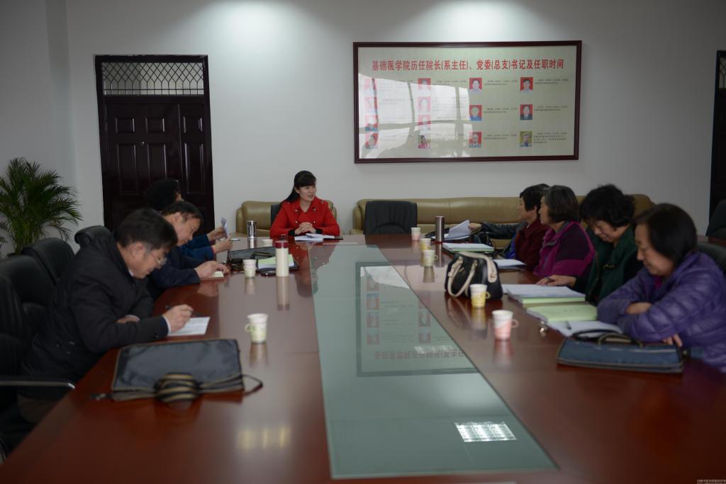 曹珊副院长首先向督导组专家汇报了2014年度基础医学院教育教学工作的开展情况及取得的主要成绩,并对督导组专家的辛勤付出表示了诚挚的感谢。根据学校对教学督导工作的新要求,基础医学院从在职教师中新增了两位教学经验丰富的资深教师加入到教学督导队伍,目前共有督导专家九人。随后,她又向督导专家们介绍了2015年教学督导工作的安排,除了在原有听课评教评学、评审教研项目及教学竞赛等教学活动外,以后还将加强三期教学检查,尤其是对试卷的规范、科室记录等检查工作。希望督导专家们在新的一年里能继续发挥积极作用,通过科学合理评价,及时有效反馈,促使基础医学院教学水平不断提升。