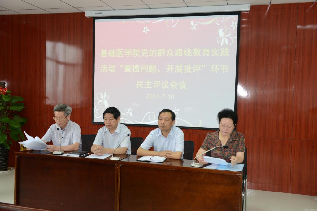 2014年7月10日上午,基础医学院在BS820召开党的群众路线教育实践活动“查摆问题,开展批评”环节群众评议工作会议。学校党的群众路线教育实践活动第二督导组组长郭德欣同志、学校党的群众路线教育实践活动领导小组办公室副主任徐江雁同志出席会议。基础医学院领导班子全体成员、学科主任、副高以上专业技术人员、科级干部、民主党派代表人士、学生代表参加会议。基础医学院党委副书记詹向红同志主持会议。