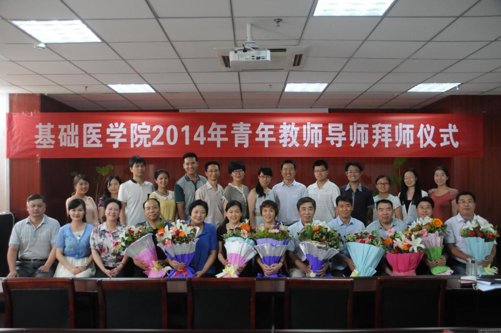 2014年6月17日下午,基础医学院2014年青年教师导师制拜师仪式在新校区教学楼BS820举行。基础医学院党政领导、导师、青年教师代表、各学科主任等40余人参加了仪式。仪式由基础医学院副院长高剑峰教授主持。