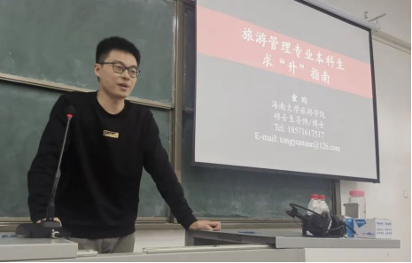接着,童昀老师以“旅游管理专业本科生求‘升’指南”为题向同学们分享了自己的“旅途”经历。童昀老师是马勇教授的学生,2020年在我校博士研究生毕业后,入职国内一流学科建设高校——海南大学,是海南大学旅游学院硕士生导师,任中国旅游研究院生态旅游研究基地主任助理,入选文化和旅游部“万名英才”研究型英才项目。童昀老师结合自己的求学、成长经历,从“我是谁”“我们是谁”“我们能成为谁?”“我们怎么成为那个人?”4个方面向大家作了分享,并用“我是旅管人,我为旅管代言”“我是湖大人我为湖大代言”“我是我自己,我为自己代言”,勉励同学们学好专业,做最好的自己,做T-generation