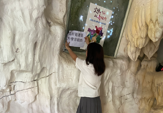 随着旅游业的发展,京舟村的民宿、农家乐等娱乐休闲场地也如雨后春笋般涌现。普通话是景区工作人员与游客朋友们沟通交流的基础和桥梁,在景区相关工作人员的积极配合下,团队成员前往景区的农家乐、便民服务站、公共厕所等多个地点张贴“请说普通话,方便你我他”的文字标识,对景区的工作人员和游客起到了一定的提醒作用。
