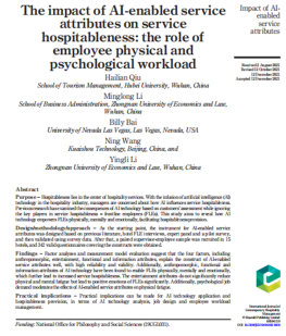 近日,旅游接待业管理领域著名国际期刊International Journal of Contemporary Hospitality Management(IJCHM)在线发表了湖北大学旅游学院博士后邱海莲与李明龙、Billy Bai、王宁、李莺莉等共同撰写的实证研究成果“The impact of AI-enabled service attributes on service hospitableness: The role of employee physical and psychological workload”(AI服务属性对服务好客度的影响—员工生理和心理工作负担的角色视角)。