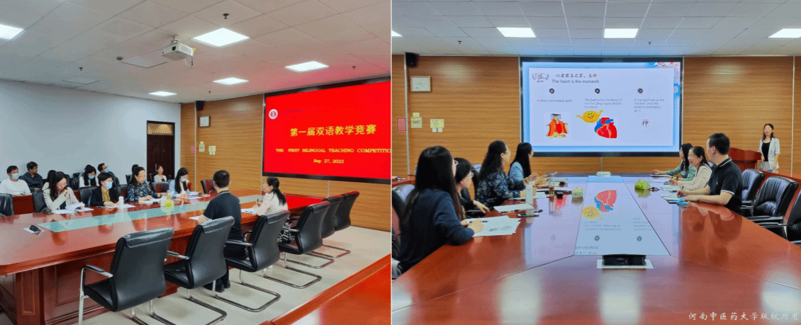 本网讯(文/华金双 图/陈毅恒 )2022年9月27日下午,中医学院(仲景学院)第一届双语教学竞赛在新校区综合教学楼A447会议室举行。本次竞赛邀请了我校中原名师崔姗姗教授、外语学院副院长张冰副教授、李苹副教授、中医学院(仲景学院)梁鹤副教授担任评委,我院教学管理人员及近两年入职的新进教师到场观摩学习。