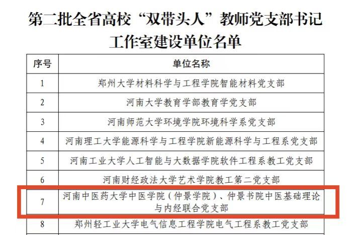 本网讯(文图/王梦婷)近期,教育部思想政治工作司、河南省委教育工作委员会先后公布了《关于第四批新时代高校党建示范创建和质量创优工作遴选结果的公示》、第二批全省高校党建工作强基引领“三级联创”和高校“双带头人”教师党支部书记工作室建设工作的评选结果,中医学院(仲景学院)中医诊断与方剂学联合党支部获批第四批“全国党建工作样板支部”培育创建单位,学院党委获批第二批“全省党建工作标杆院系”培育创建单位,中医基础理论与内经联合党支部获批第二批全省高校“双带头人”教师党支部书记工作室建设单位。