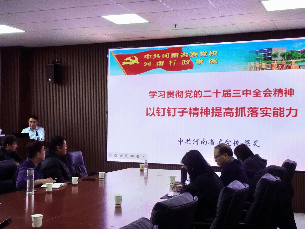本网讯(文/宋丹萍 图/古豫蕾)为深入贯彻落实党的二十届三中全会精神,2024年12月3日,中医学院(仲景学院)、仲景书院邀请中共河南省委党校梁昊副教授做了《学习贯彻党的二十届三中全会精神-以钉钉子精神提高抓落实能力》的专题讲座,学院领导班子及各支部委员会成员到场聆听学习,讲座由学院党委书记袁晓宇主持。