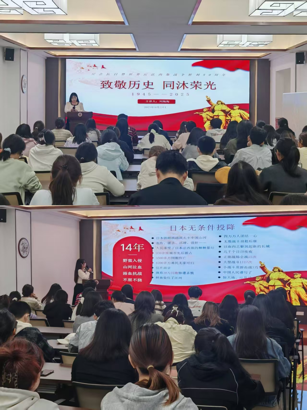 团课中,刘淘淘带领大家系统回顾了从局部抗战到全面抗战的烽火岁月,讲述了英雄先烈们可歌可泣的事迹,深刻阐释了爱国、团结、坚韧、自强的抗战精神内涵。
