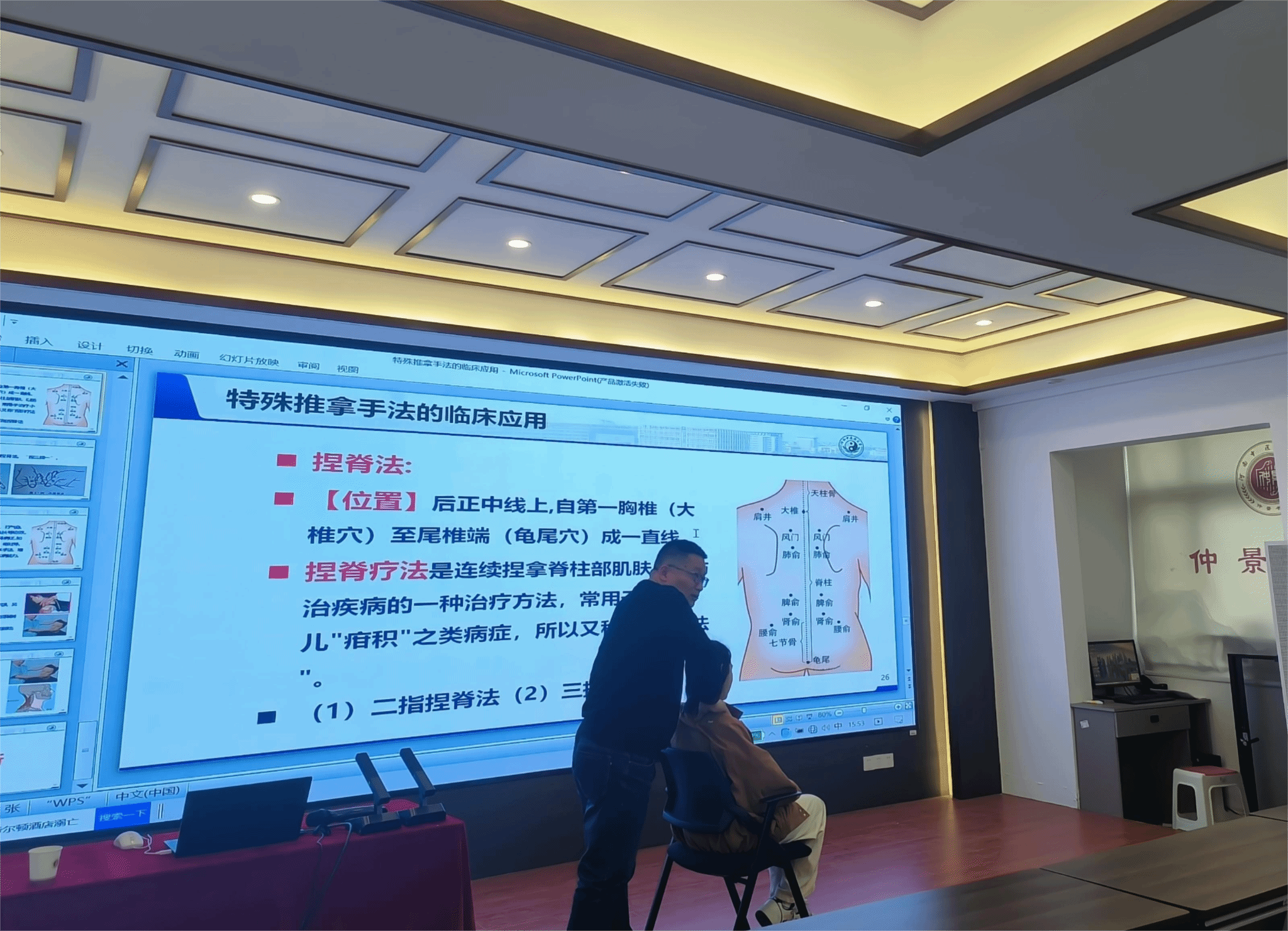 王老师以“特殊推拿手法的临床应用”为主题,从推拿发展脉络角度从秦汉时期、明清时期、民国时期讲解推拿的起源和发展概况,同时结合临床教学案例,通过摩腹、背法、拿肩井、捏脊法、颈椎斜扳法几种推拿手法的临床应用进行现场演示,并着重讲解了推拿手法的禁忌要点和注意事项。最后王老师对推拿学的未来发展和专业研究前沿进行了归纳总结,其幽默风趣的授课风格,通俗易懂的讲解受到同学们的一致好评,现场气氛活跃、互动频繁。