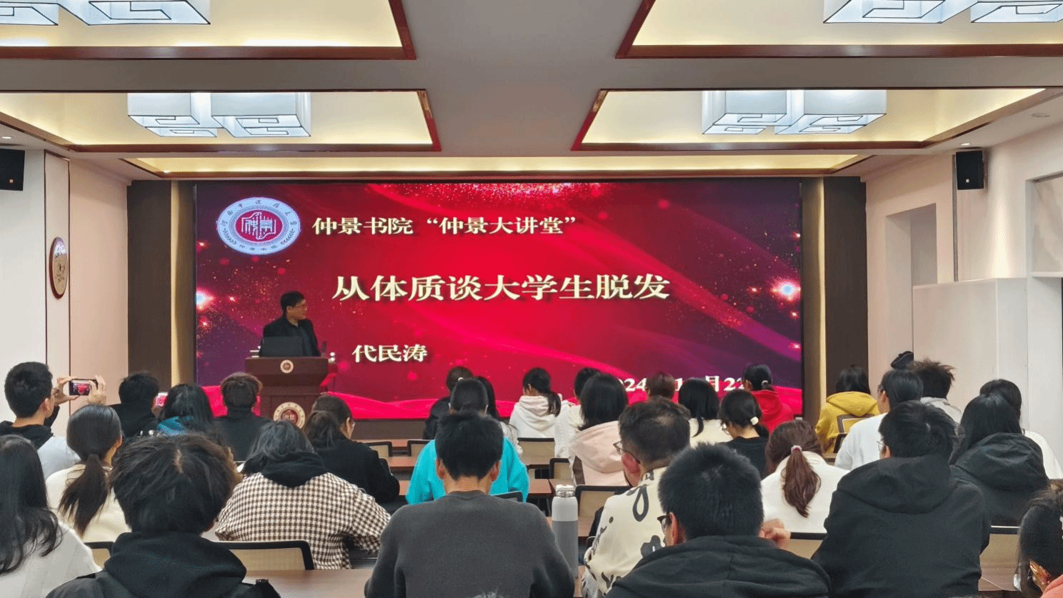 代民涛老师以“从体质谈大学生脱发”为主题,向同学们介绍不同体质大学生脱发原因及其干预手段。他首先从古代诗词作家脱发现象引入主题,对日常生活中易引起脱发的生活习惯,如熬夜、过度烫染头发等进行阐释,同时将中医理论中的九种体质分为三类,分别对三类体质的表现特征进行介绍,深入分析其脱发原因,进而提出解决方案。在讲座中,代民涛老师列举了日常生活中常见且易得的药物食材,极具实用性和实践意义。最后,他指出要应对脱发,预防很重要,同学们需要改善自己的生活习惯,同时进行辨证论治。讲座结束后,代民涛老师与现场同学们进一步深入交流,对同学们提出的问题进行详细解答,在座同学纷纷表示受益颇多,现场反响热烈。