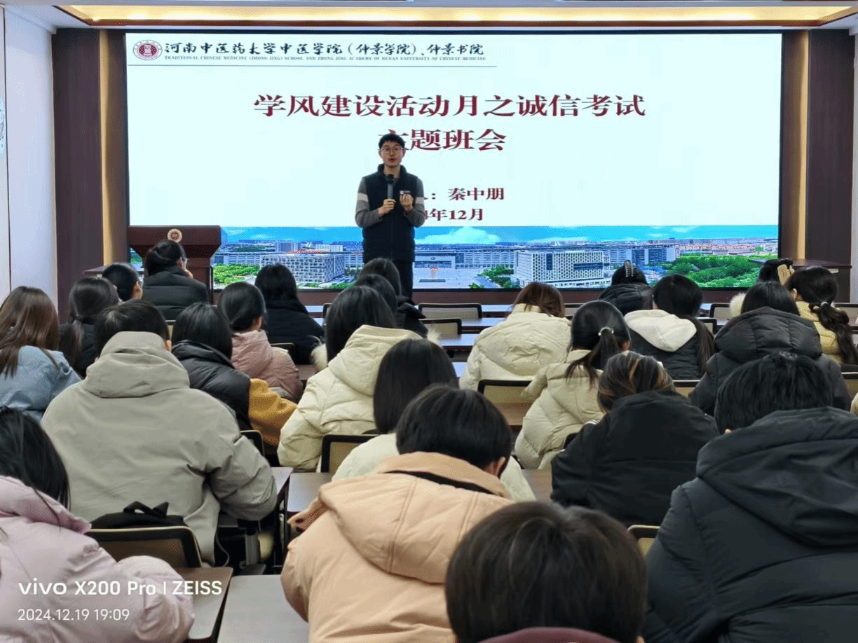 本网讯(文/图 秦中朋)学以载道,诚信为本。临近研究生初试和期末考试,为进一步加强学风建设,增强纪律意识,严肃考风考纪,营造守信守纪、文明和谐的良好氛围,2024年12月16日-20日,中医学院(仲景学院)、仲景书院各班相继开展了学风建设暨诚信考试主题班会。