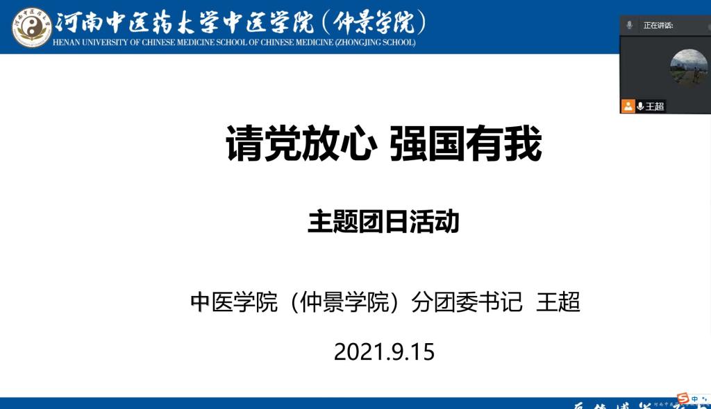 为深入贯彻学习习近平总书记“七一”重要讲话精神,切实践行校团委相关工作部署,加强对我院广大团员青年的思想政治引领,2021年9月14日下午,中医学院(仲景学院)分团委积极开展线上“请党放心,强国有我”主题团日活动。学院分团委书记王超线上主持并宣讲,学院全体团员参加。