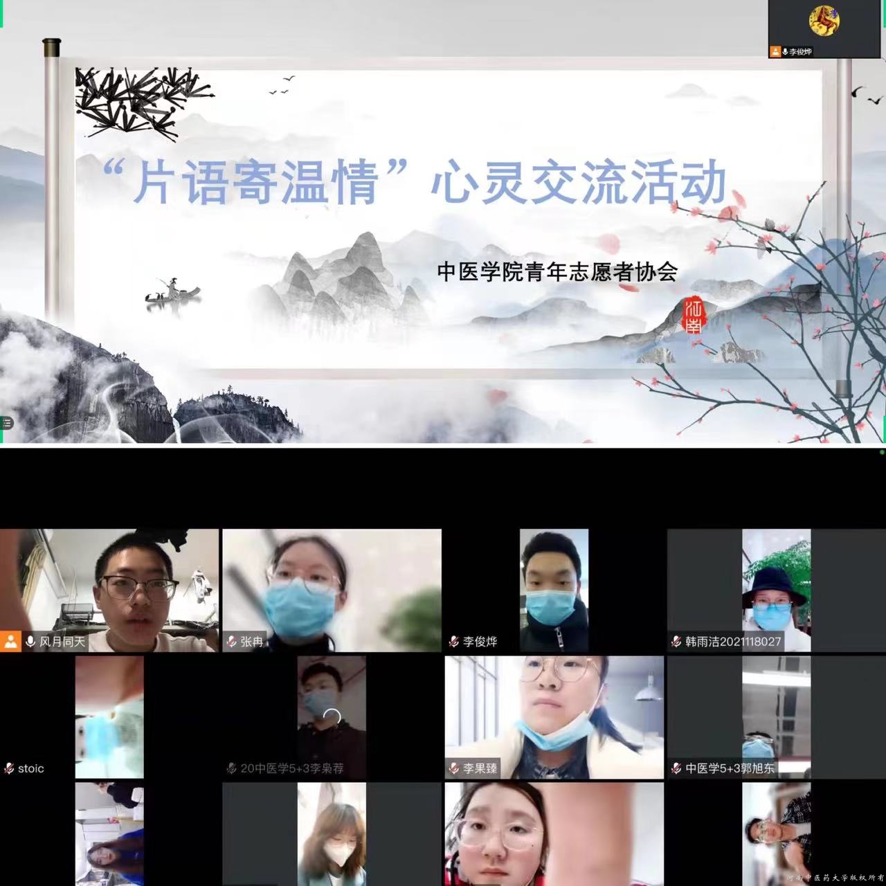 本次活动通过线上的形式开展,活动中,2021级中医学(5+3一体化)本科班新生和20级学长代表充分研讨,从专业学习、方式方法、效率提升、心理健康建设等方面进行了深入交流,20级同学代表从如何做好专业学习、双创工作、心理健康教育逐一进行了耐心解答,线上活动氛围温馨融洽,同学们获益匪浅,新生同学们对新学期学习生活有了更进一步了解和规划。