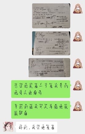 上课时间起初是星期天上午2个半小时,后来加了物理,从星期三和星期五晚上再各上1小时到现在因为课程增多时间冲突而改成星期天下午3小时,星期六晚上2小时不确定。初三科目对我来说还是有点挑战,而小唐基础还可以,所以压力会比较大。每次都会花相同或者跟多时间用来备课,找符合她基础的题目和整理考点。通过当老师的过程也体会到了老师备课的辛苦,要学会多多体谅老师们。每次课堂时间过得很快,讲着讲着3个小时就溜走了,很享受这个过程。印象比较深的两次,第一次是自己讲着讲着麦克风好像有问题(当时还没发现),直到问问题半天没人应回头看小唐一大串问号表情包才知道,后面又尴尬地重新讲了一次。第二次是关于物理通路断路的一个题目最后一个选项自己讲不清楚时的尴尬,不过好在快下课了,然后找了大神搞明白后才得以解决。但是好在小唐性格比较温和,谅解了我的不足,同时自己也增加了一定的授课经验。