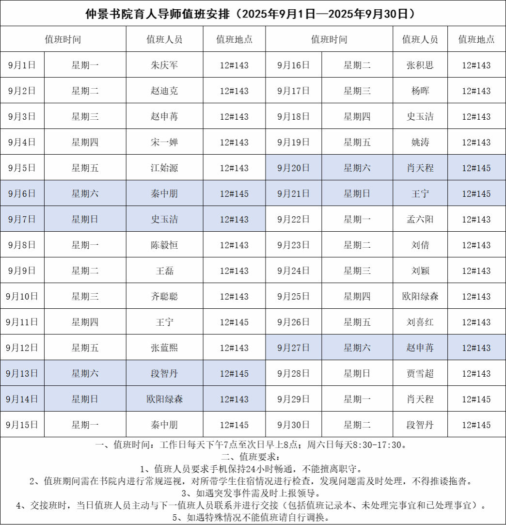 仲景书院育人导师值班安排(2025年9月1日—2025年9月30日)