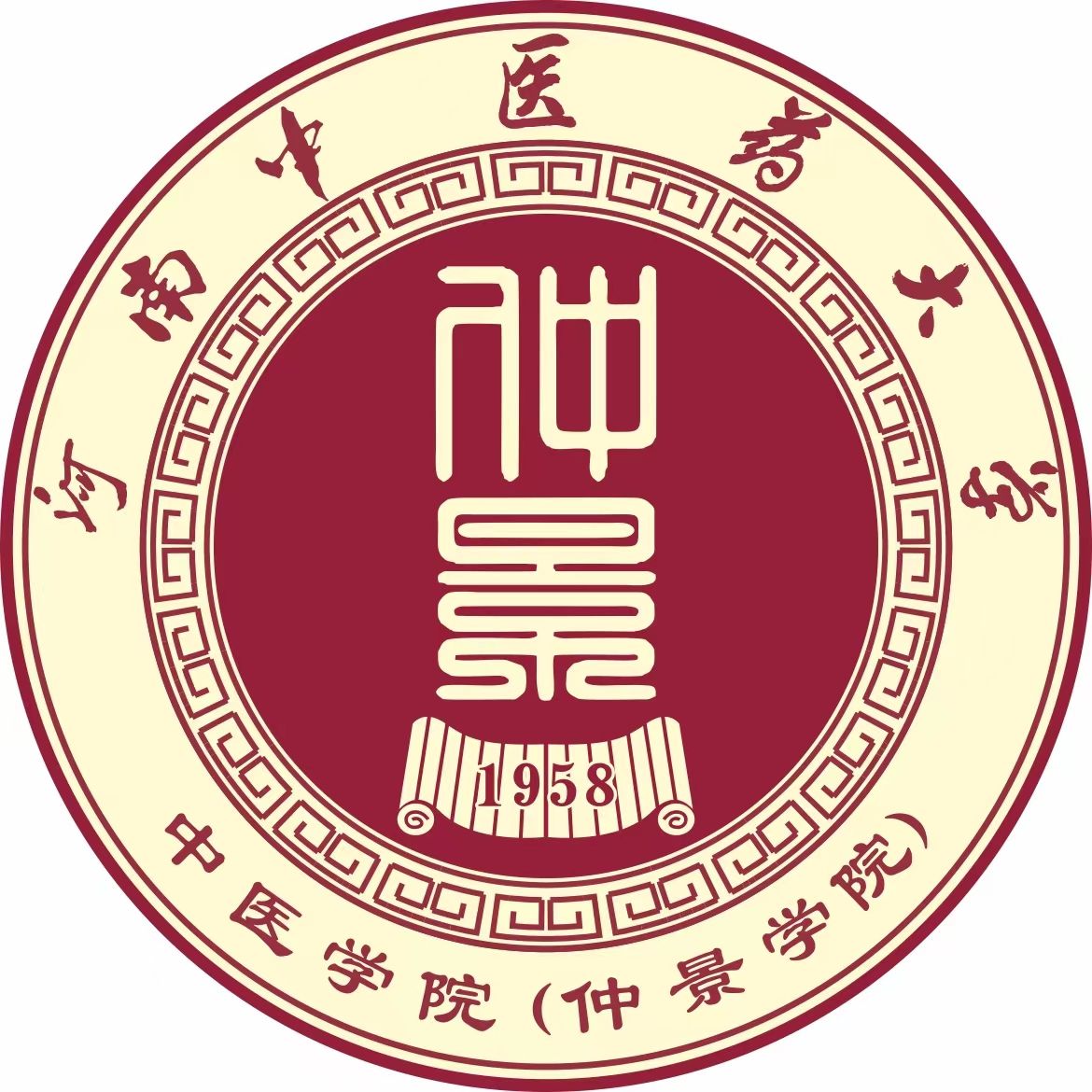 院徽中文名“中医学院(仲景学院)”采用隶书字体,庄重典雅,文脉相承,并保持与上部校名“河南中医药大学”郭体字的协调性:中间位置大面积红色,重点宣示中华医药文化背景:底部的1958,则表示学院创建的时间。